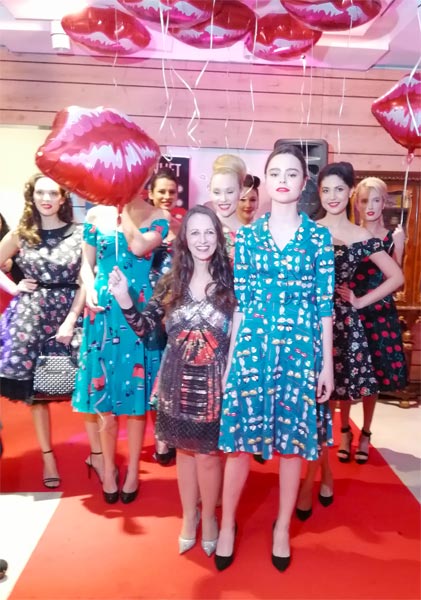 Image below right: Red dress from the store range of 1950s inspired women's wear. Several items of the collection are made of patterns with eye catching prints such as on view at the image: The music notes dress shows above the hemline vinyl records and a dancing couple.