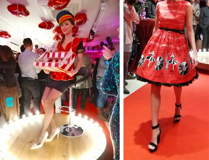 Image below left: At the entry of the party, a candy girl dressed in the style of the 1950s welcomed the guests.