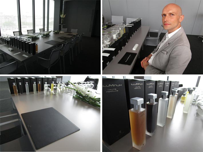 Learning never ends! On the first sight, the Niemeyer Suite at Hotel Sofitel with large table and writing material in front of each chair had the appeal of a seminar room; they handed out memo pad, pen, and the folder with the description of Illuminum's collection of perfumes which are now also available at the shop for haute perfumery 'Le Parfum' in Vienna. The 'instructor' of the perfumery lesson was the label's fragrance specialist himself Bart Pawlak (image below) who guided the journalists through 16 scents - eight from the 'Vaporizer'-collection and eight of the 'Haute Perfume'-line. The scents were presented on test-papers in cognac glasses where they spread their auras - better than on the classical test-papers without glass around! The expert Bart Pawlak spoke about the